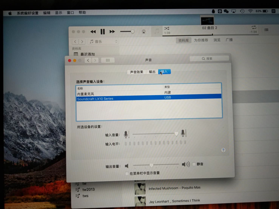 圖20:這里用的是OS系統自帶播放器,有些播放器可能需要在軟件本身再做一次聲卡輸出的選擇。另WIN系統也一樣要先把系統聲音輸入輸出選項有電腦本身揚聲器改為LX10調音臺聲卡;低版本的WIN系統有可能還需要安裝LX10聲卡驅動。
