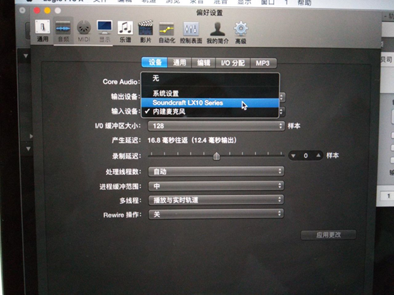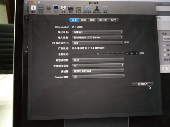 圖26:改好以后需點擊應用更改,使更改生效。如果你要用此軟件進行錄音回放,那么你的輸出設備也應改為調音臺輸出。我這里沒用到就沒做更改。