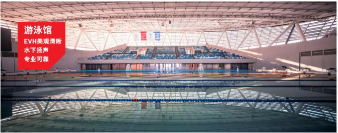 游泳館除了設有標準競賽游泳池、訓練池外,還設有各種水療休閑設施、部分水上用品商業以及兒童娛樂池和滑道等,供普通市民休閑娛樂使用。在游泳館頂部,業主同樣選用了白色EVH系列揚聲器,在美觀度和品質方面和場館高度統一。
