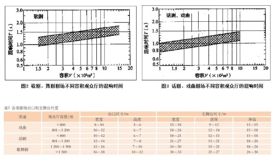 不同功能劇場的混響時(shí)間,GB/T50356—2005《劇場、電影院和多功能廳堂建筑聲學(xué)設(shè)計(jì)規(guī)范》(以下簡稱GB/T 50356—2005)中均有規(guī)定,詳見圖2、圖3,以戲曲功能為主的劇場,在相同容積下,其觀眾廳混響時(shí)間較其它功能劇場低。同時(shí),舞臺(tái)建設(shè)依據(jù)JGJ 57—2016《劇場建筑設(shè)計(jì)規(guī)范》,臺(tái)口和主舞臺(tái)尺度如表2,舞臺(tái)的空間通常比較大。因此,大空間的舞臺(tái)與規(guī)模不大的觀眾廳的聲耦合,也是聲學(xué)設(shè)計(jì)中需要考慮的問題。