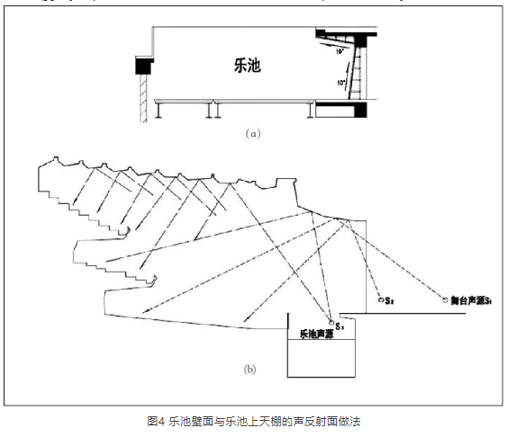 需要注意的是,初步按此確定臺(tái)口天花板反射面后,還要適當(dāng)調(diào)整此面,盡可能兼顧近次反射聲對樂池的覆蓋。當(dāng)然還可利用樂池的某些壁面作反射面,如圖4所示。