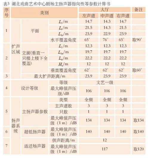 湖北戲曲藝術(shù)中心劇場擴(kuò)聲主揚(yáng)聲器聲線圖如圖7所示。依據(jù)上述理論設(shè)計(jì)揚(yáng)聲器系統(tǒng),計(jì)算過程及結(jié)果如表3所示,包括揚(yáng)聲器的垂直方向角、水平方向角和最大聲壓級(jí)等參數(shù)的選取。