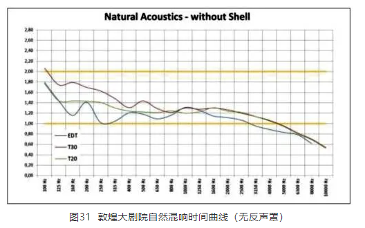 敦煌大劇院落成于2016年8月,共有座位數(shù)1 206座,以出演歌舞劇為主,兼顧戲曲、話劇、會(huì)議等其他功能。其中歌舞劇部分需涵蓋國內(nèi)外大型歌劇、舞劇、芭蕾舞劇以及大型綜合歌舞節(jié)目的演出需求。根據(jù)上述使用功能,該劇院的自然混響時(shí)間以滿足會(huì)議、話劇等功能為主進(jìn)行建設(shè),其他演出功能則通過舞臺(tái)聲學(xué)反聲罩以及電子聲學(xué)環(huán)境可變系統(tǒng)予以靈活適配。在不使用聲學(xué)反聲罩的情況下,該劇院的空?qǐng)龉逃凶匀换祉憰r(shí)間為1.3 s(見圖31),而使用反聲罩時(shí),則為1.7 s。