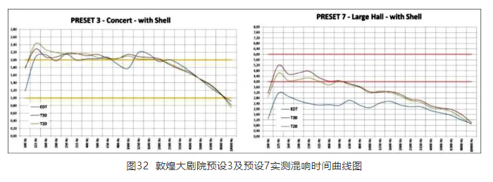 系統(tǒng)設(shè)置了8個(gè)預(yù)設(shè)模式,其中4個(gè)適用于獨(dú)奏、室內(nèi)樂和管弦樂,2個(gè)預(yù)設(shè)可應(yīng)用于歌劇和類似的場景,另外2個(gè)則為長混響時(shí)間的特殊預(yù)設(shè)模式。這些預(yù)設(shè)中的5個(gè)又分為使用聲學(xué)反聲罩和不使用聲學(xué)反聲罩兩種情況,以更為細(xì)致準(zhǔn)確地滿足不同節(jié)目類型的需要。預(yù)設(shè)的混響時(shí)間分別為:1.4 s、1.6 s、1.8 s、2.0 s、2.2 s、2.4 s、3.2 s和5.0 s。根據(jù)使用需求不同,在改變混響時(shí)間的同時(shí),各預(yù)設(shè)的偏重也略有不同,可實(shí)現(xiàn)早期反射聲、混響聲比例以及明晰度指標(biāo)C80等多方面的調(diào)整。圖32即為預(yù)設(shè)3和預(yù)設(shè)7的實(shí)測混響時(shí)間曲線圖。
