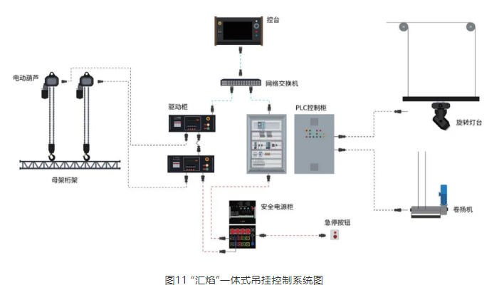 匯焰開發的一體式機械智能吊掛控制系統(見圖11),實現了傳統PLC控制吊桿和數控葫蘆系統的統一控制。系統通過數控葫蘆吊掛桁架作為固定吊桿的補充,原有吊桿與桁架可通過該系統實現一體式控制。系統根據需要組合擴展或臨時變更,通過對數控葫蘆編程控制,可實現桁架各種高度和角度的升降、偏轉。該系統也具有實時監測承重載荷、舞臺機械位置和運動狀態、遠程控制時間碼同步、可視化對話界面等功能。