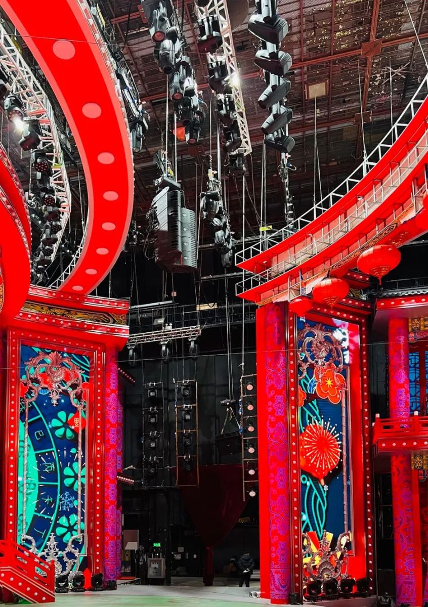 此次遼視春晚舞美設(shè)計較為復(fù)雜,舞臺頂部使用了喜慶的中式風(fēng)格,有中式建筑的頂部橫梁,還懸掛有多只大紅燈籠。為滿足拍攝的美觀需求,曾多次調(diào)整主擴系統(tǒng)的吊裝高度和位置,最終主系統(tǒng)被吊掛在舞臺兩側(cè)上空10.5米的高度,隱藏在中式風(fēng)格弧型橫梁的后部,毫無違和感。