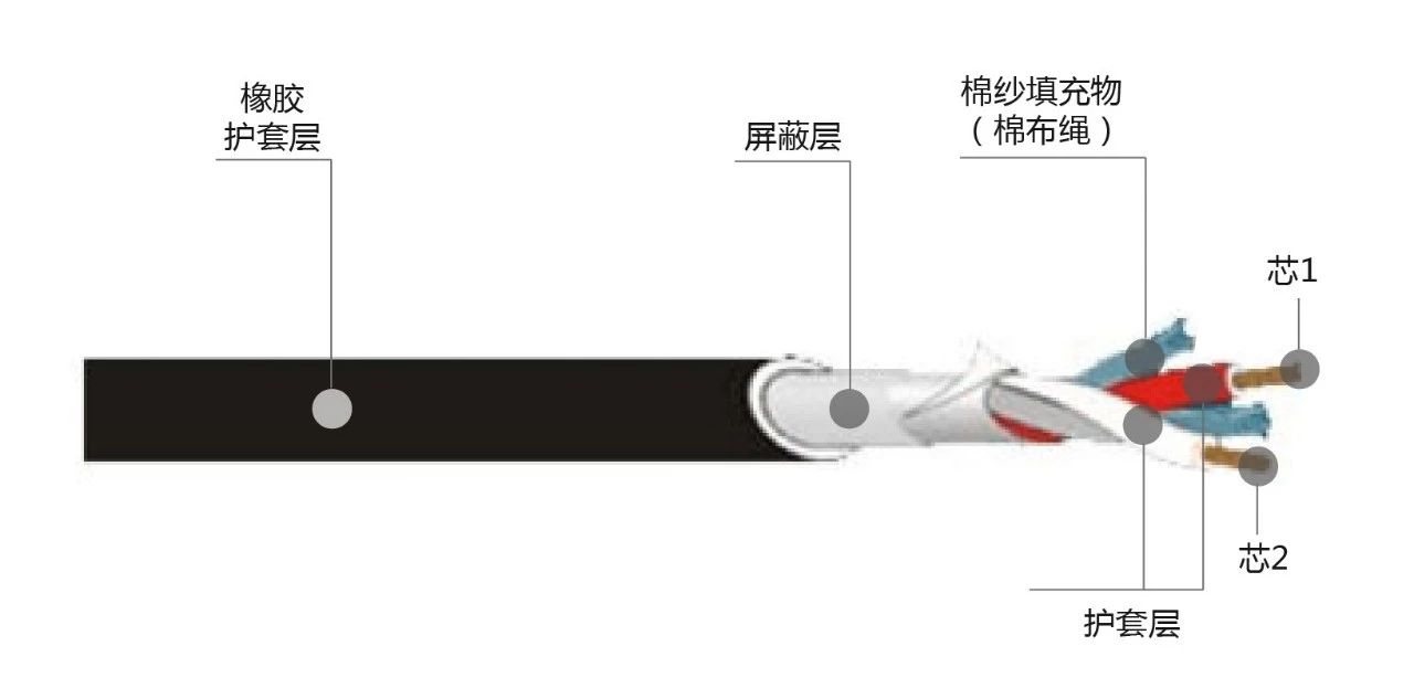 話筒線為二芯帶屏蔽(按嚴格要求應芯及屏蔽應為無氧銅材質),每芯為若干細銅絲的結構。通常由兩芯、每芯的護套層、抗拉棉紗填充物、屏蔽層及外層橡膠護套層組成。