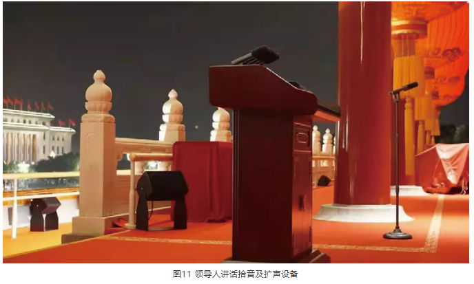 天安門城樓區域的擴聲系統主要包括:演講臺周邊返送揚聲器系統、城樓大殿前區擴聲揚聲器系統、東西城臺擴聲揚聲器系統、城樓下音效揚聲器系統等。