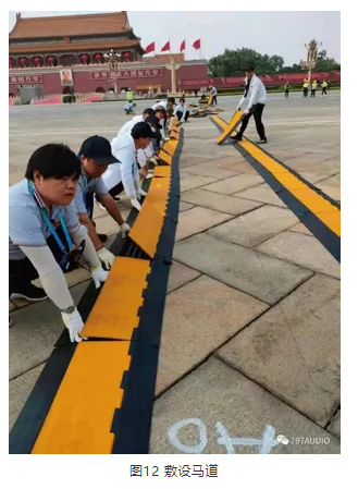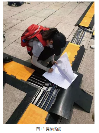 由于廣場地區的座椅、設備、線纜大部分都是為本次活動臨時搭設的,為了滿足流動拾音及擴聲、電視轉播、新聞報道及其他各指揮部的信號傳輸及用電需求,現場需要臨時敷設大量的強、弱電線纜,如圖12、圖13所示。而這些線纜與現場觀眾及演職人員的進出場通道存在交叉,無論是對各部門的系統安全還是現場人員的人身安全都有一定隱患。同時,大會進、撤場時間十分有限,特別是大會結束后,現場所有流動系統設備包括線纜必須在1.5 h內全部撤除完畢,撤除過程中不能與人員、工程車輛、設備設施等產生交叉和沖突。