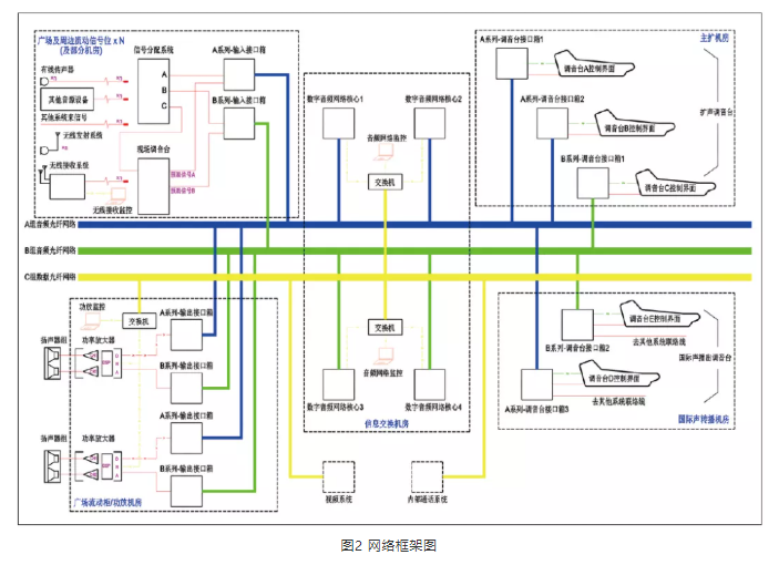 音響系統共設置5個功能子系統,包括:負責音頻信號傳輸和交換的“音頻傳輸網絡”;負責控制和其他信號交換的“數據傳輸和指揮網絡”;負責現場聲音信號拾取的“現場拾音系統”;負責提供現場擴聲服務的“現場擴聲系統”;負責國際聲信號制作的“國際聲制作及多聲道錄音系統”。