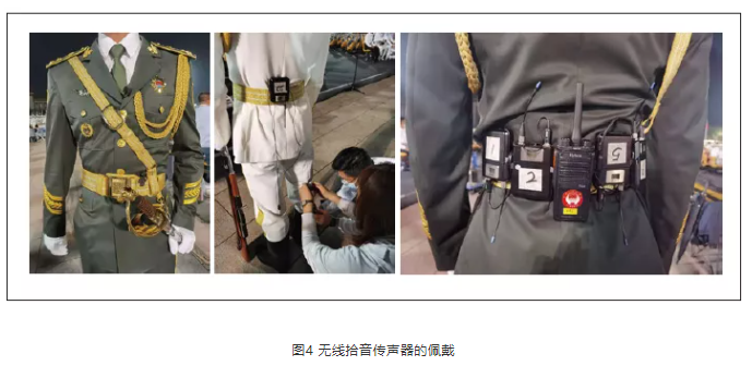 國旗護衛隊的口令、抽刀、腳步的拾音使用的是有線+無線的方式。從人民英雄紀念碑到國旗桿之間280 m,有線拾音傳聲器沿紅毯沿線均布,同時,在紀念碑臺階和國旗座附近分別設置了用于拾取抽刀和配槍的效果聲傳聲器。無線拾音傳聲器佩戴于護衛隊的胸口、靴子、腰帶上,如圖4所示,傳輸系統采用四分集技術,保證信號的安全可靠。通過現場實時的頻率監控,有效屏蔽干擾信號。