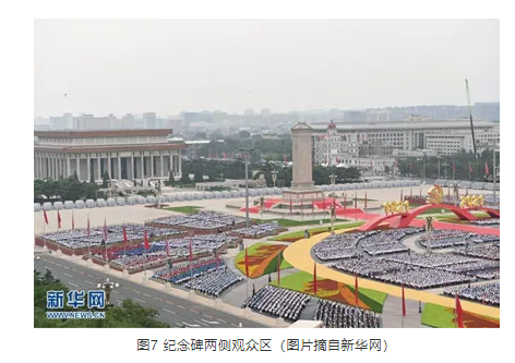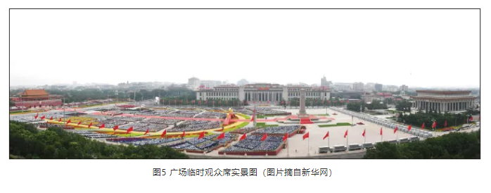 廣場區域主要包括北臨長安街中線位于獻詞團兩側的觀眾席,南至紀念碑,西至廣場西側路,東至廣場東側路。這個區域也是觀眾數量最多、最集中的地區。