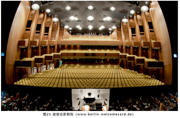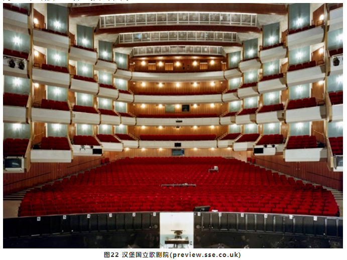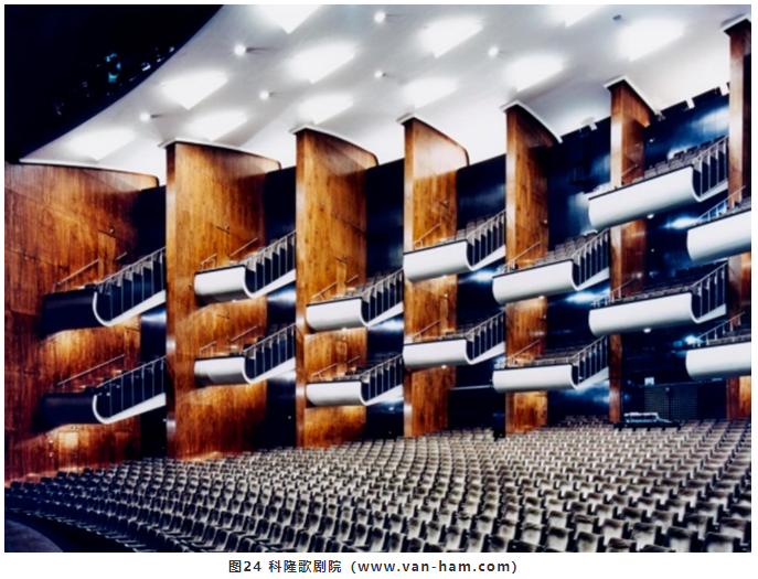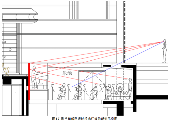 對于歌手而言,提供<35ms早期反射聲,只有舞臺(tái)上布景的反射以及臺(tái)口側(cè)墻(包括臺(tái)框和臺(tái)口側(cè)包廂或樓座欄板)的散射能夠做到。對于樂隊(duì)而言,下沉式樂池四周的墻面、懸挑的頂部以及池座上部的包廂欄板等都能提供充足的<35ms早期反射聲。