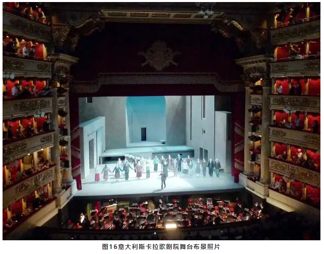 對于歌劇演出來說,舞臺(tái)上的聲學(xué)條件很重要,尤其是對歌手來說。舞臺(tái)內(nèi)唯一可能為歌手提供早期反射的表面就是舞臺(tái)布景,所以一般都會(huì)設(shè)置類似反聲罩的布景(見圖15、16)。這種措施不僅是歌劇劇情演出的需要,還可以起到提高歌手之間的相互聽聞和響度的作用。