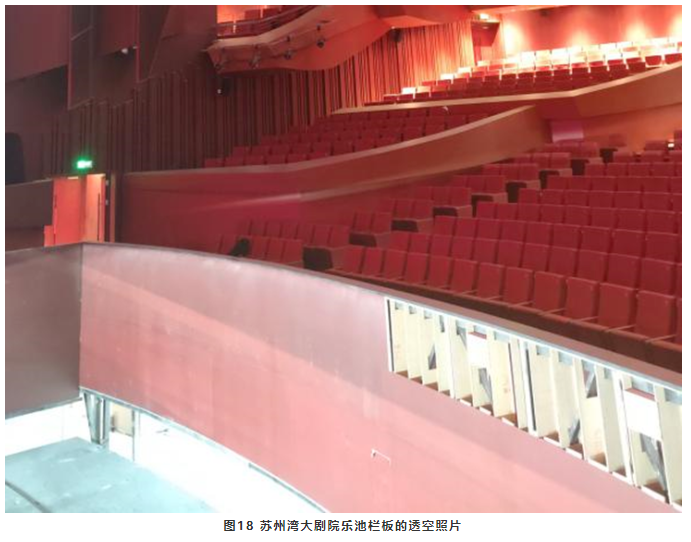由于樂池的下沉,歌手和樂隊(duì)彼此之間大多數(shù)看不到對方,也就是說他們之間缺乏直達(dá)聲進(jìn)行交流,通過反射面提供<35ms的早期反射聲進(jìn)行交流就至關(guān)重要。樂池欄板是歌手和樂隊(duì)之間最近的反射面(見圖17),因此欄板必須是硬的反射面。蘇州灣大劇院樂池的右側(cè)欄板采用透空做法(見圖18),優(yōu)點(diǎn)是可以提高了樂隊(duì)的聲級(jí)特別是高頻聲,增加樂隊(duì)演奏聲的亮度。但是卻產(chǎn)生了三個(gè)不利因素:一是打破了歌手和樂隊(duì)之間的平衡,使樂隊(duì)聲能可能蓋過了歌手;二是減少了歌手和樂隊(duì)之間的早期反射聲交流,不利于演出的同步性;三是觀眾可以隱約看到樂譜燈光,干擾觀看演出。綜合考慮這種做法并不可取。