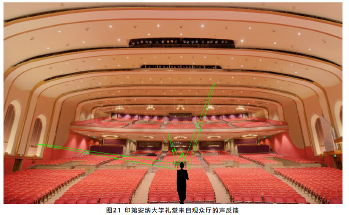 在歌劇院中,歌手和樂隊(duì)都需要聽到來自觀眾廳的聲音反饋,然后根據(jù)反饋的聲音相應(yīng)地控制自己的歌唱和演奏的響度。歌唱歌手特別希望喜歡聽到他們的聲音在一個(gè)比較舒暢的發(fā)聲水平時(shí)能“充滿大廳”。這就需要池座的后墻、挑臺(tái)欄板以及吊頂?shù)炔课荒軌驅(qū)⒙曇舴瓷涞轿枧_(tái)和樂池內(nèi)。但需要合理控制反射聲的大小,避免反射聲太強(qiáng),成為回聲。